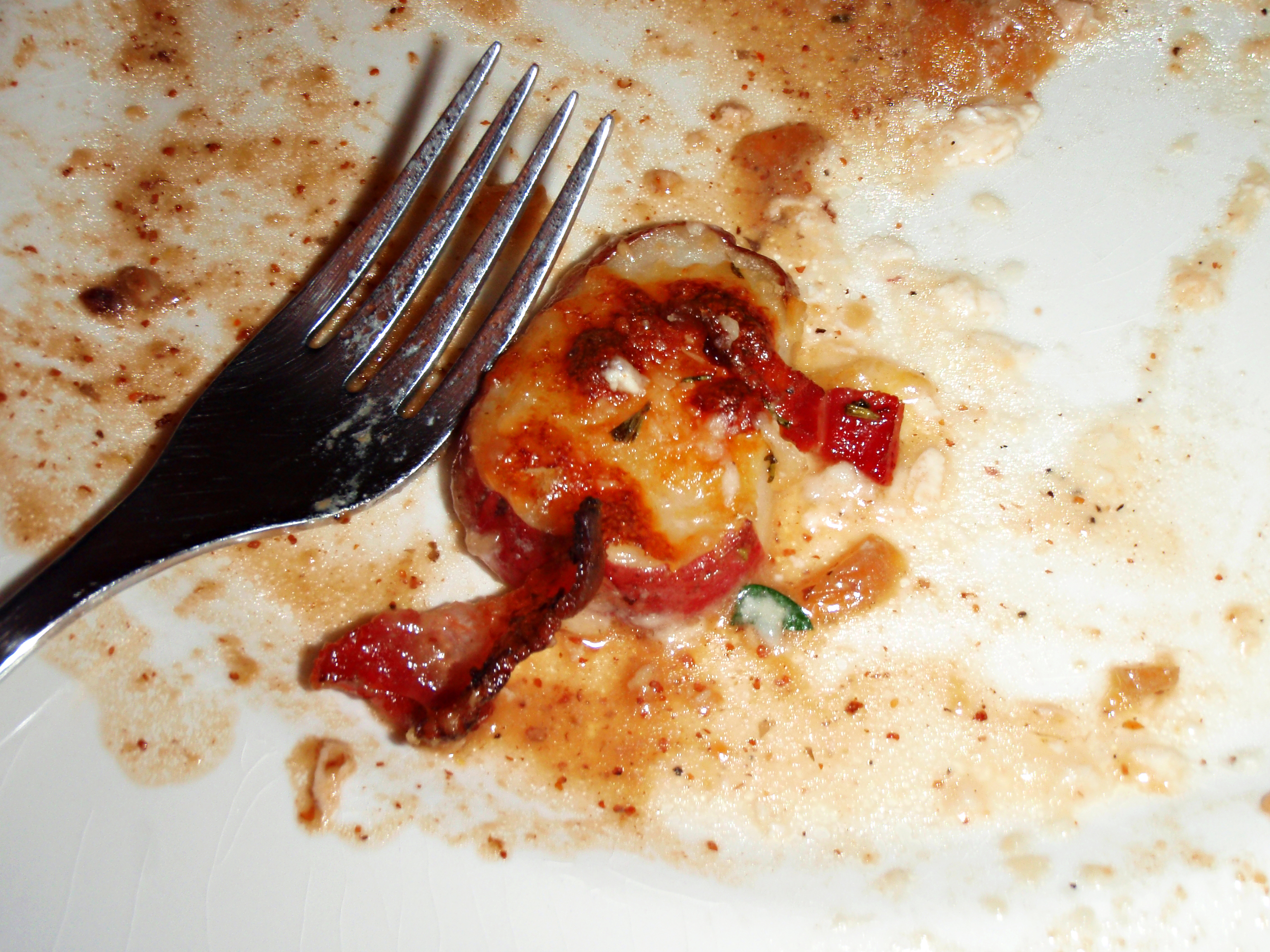 Layer 1/2 of potoates in a gratin or casserole dish. Sprinkle carmelized onions over potatoes than add second layer of potates. Pour gratin sauce over then top with parmesan cheese, and 1 teaspoon rosemary (finely chopped). Sprinkle bacon over top.