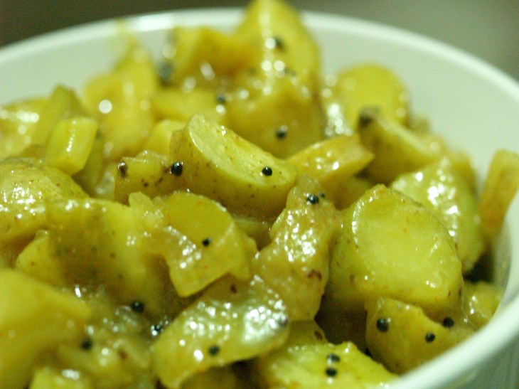 Ingredients 1 1/2 pounds fingerling potatoes 3-4 tablespoons canola oil 1/2 teaspoon mustard seeds 1/4 teaspoon ground turmeric 1/2 yellow onion, thinly sliced (equaled 2 cups for me) 2 teaspoons salt (!) 1/2 teaspoon cayenneDirectionsSlice potatoes in to quarters then crosswise in to 1/4 inch slices. The original called for red skins and smaller chunks but this is what I needed to use up and hello, Olympics are on!