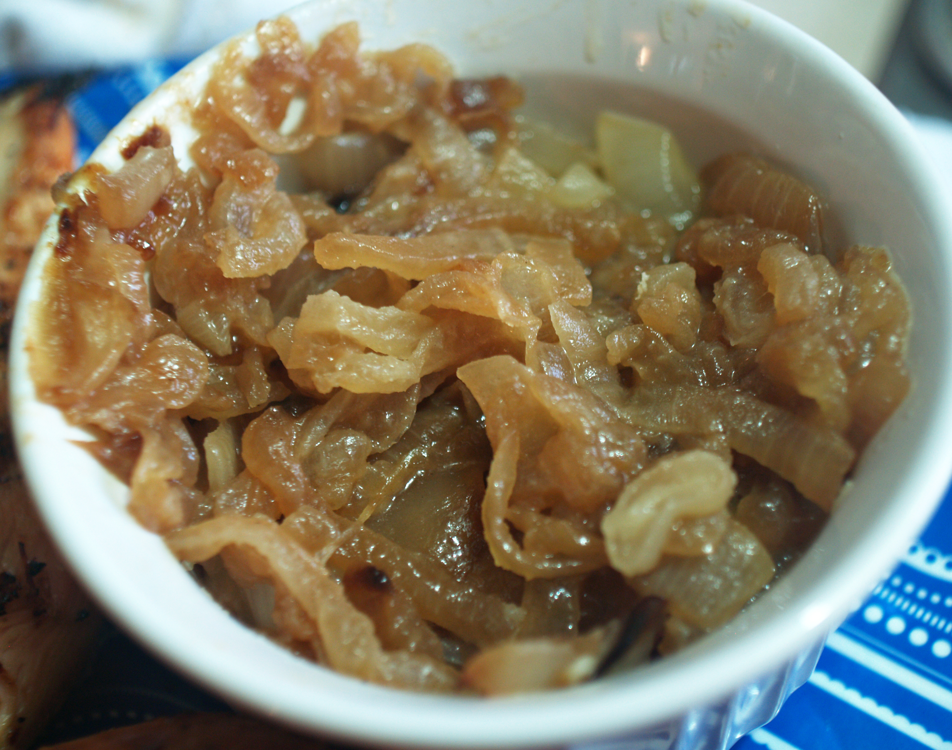 Tonight, I sliced up 1 1/2 Vidalia onions, heated up 1 tablespoon olive oil and 2 tablespoons butter then added the onions, letting them cook slowly until they were goldeny brown and sweet: