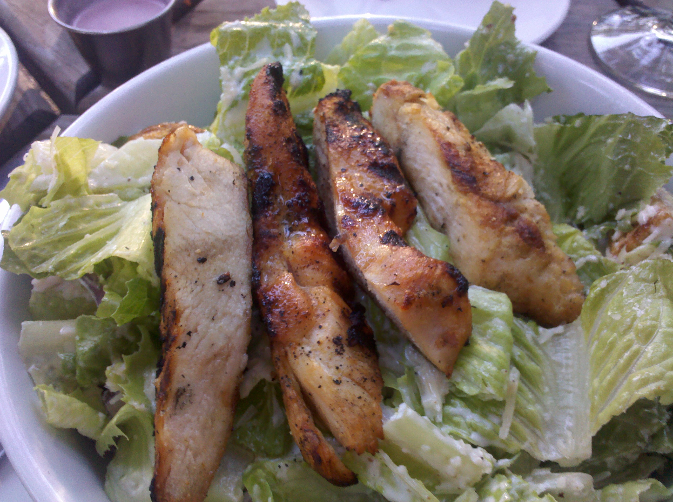 I had a hard time choosing but a craving for ‘green’ and crunchy’ led me to the Caesar salad with added chicken. The salad includes anchovies but whole ones so I just set those off to the side.