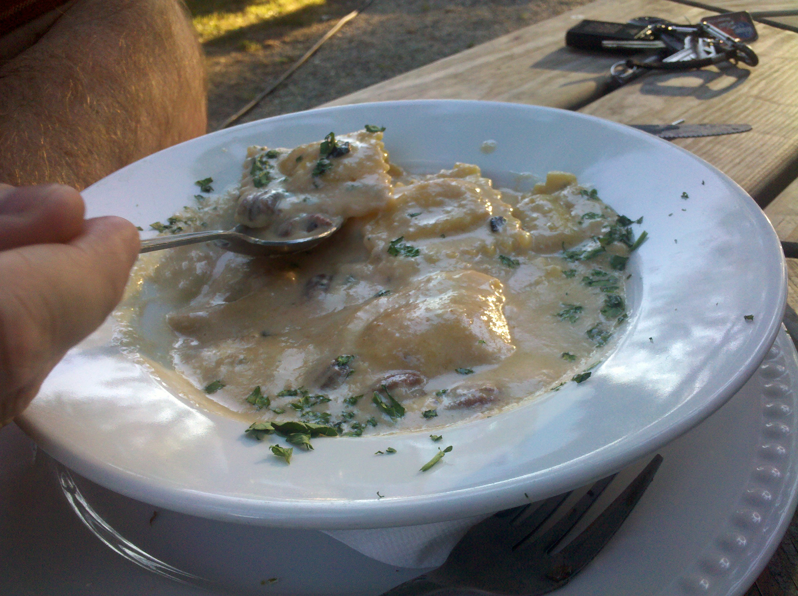 Chris had the butternut squash ravioli with a sweet, maple cream sauce and pecans. It was yummy and as you can see, I had to get my pics quick before he started chowing down.