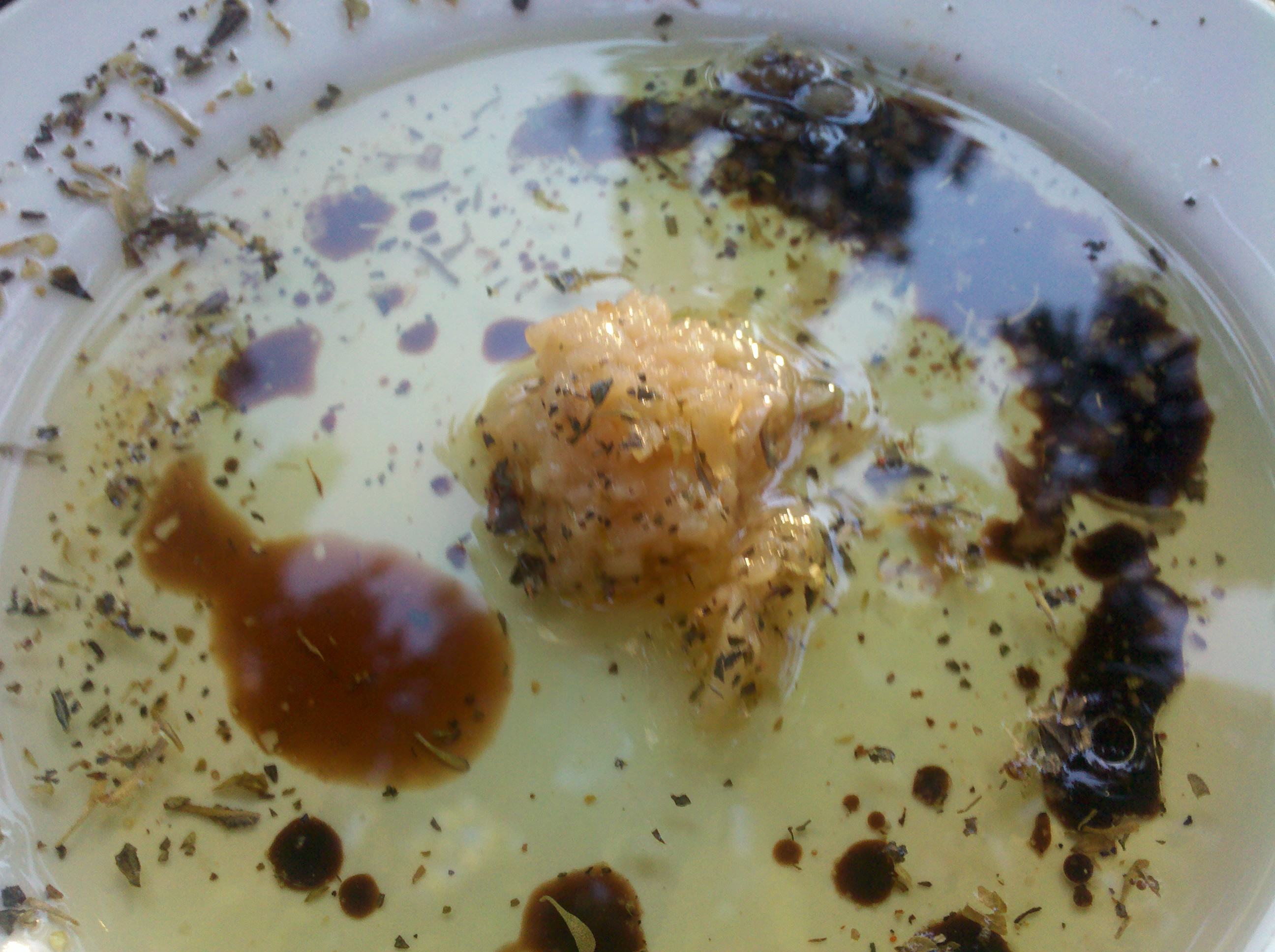Bread is served with flavored olive oil. Yes, that is a giant mound of garlic in the center. You can use as much or as little as you like. We used most of it.