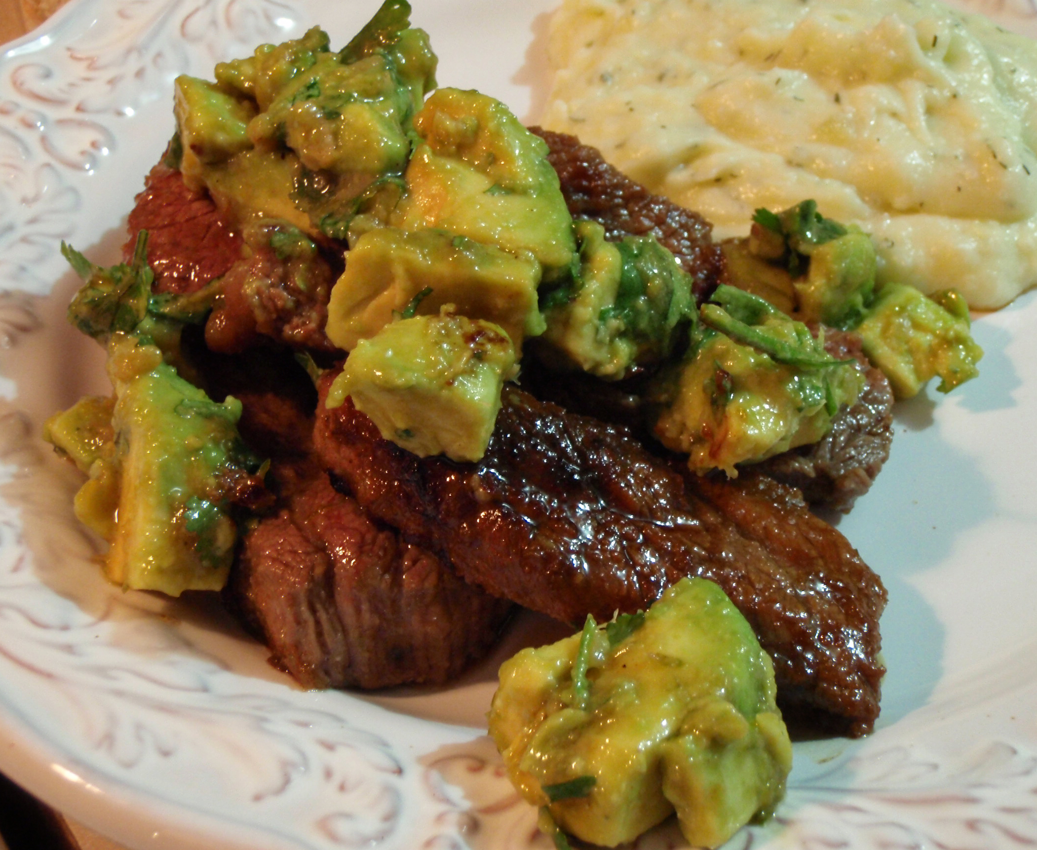 Tonight, I made steak, marinated in garlic, lime, soy sauce and rice wine vinegar (seasoned for sushi). The steak is topped with an avocado and cilantro salsa which was tossed in some of the reserved marinade. To accompany this, we had mashed potatoes seasoned with dill and horseradish. Bonus for the Spartan-themed dish.